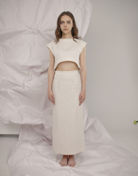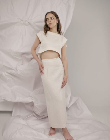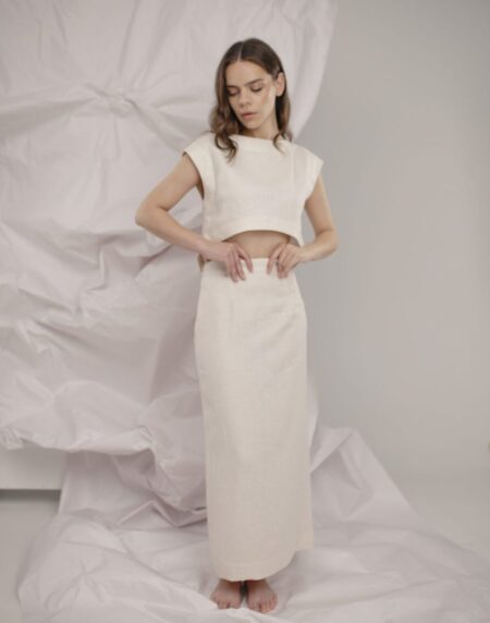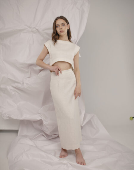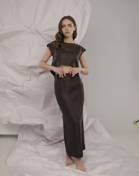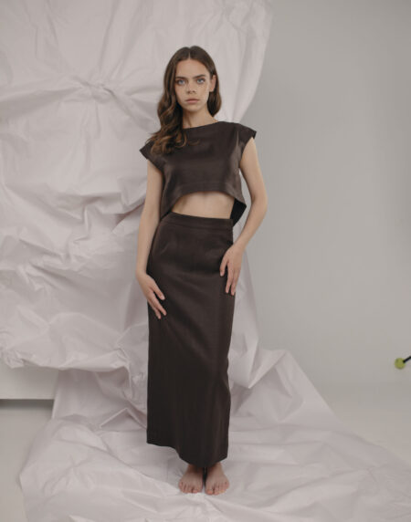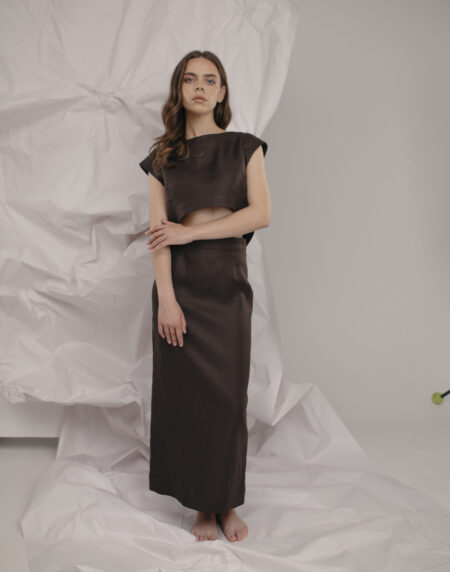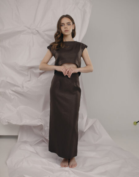 Our High-Waisted Linen Midi Skirt exudes understated elegance, crafted from premium 100% linen in a rich brown tone.
