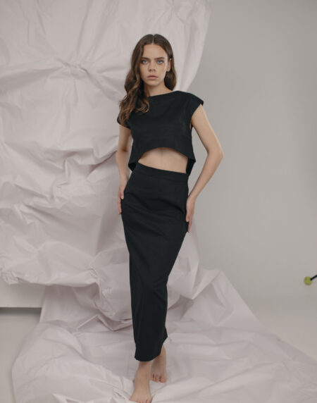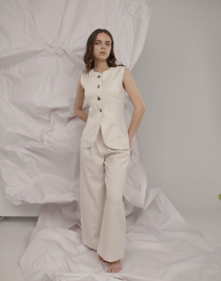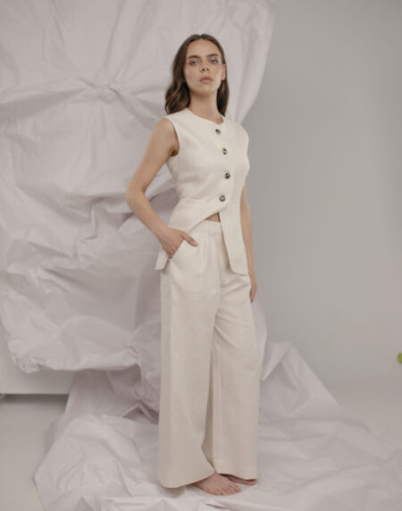 Elevate your wardrobe with the effortless elegance of our black vest and wide-leg trousers set, crafted from a luxurious linen-cotton blend for a comfortable, breathable feel.