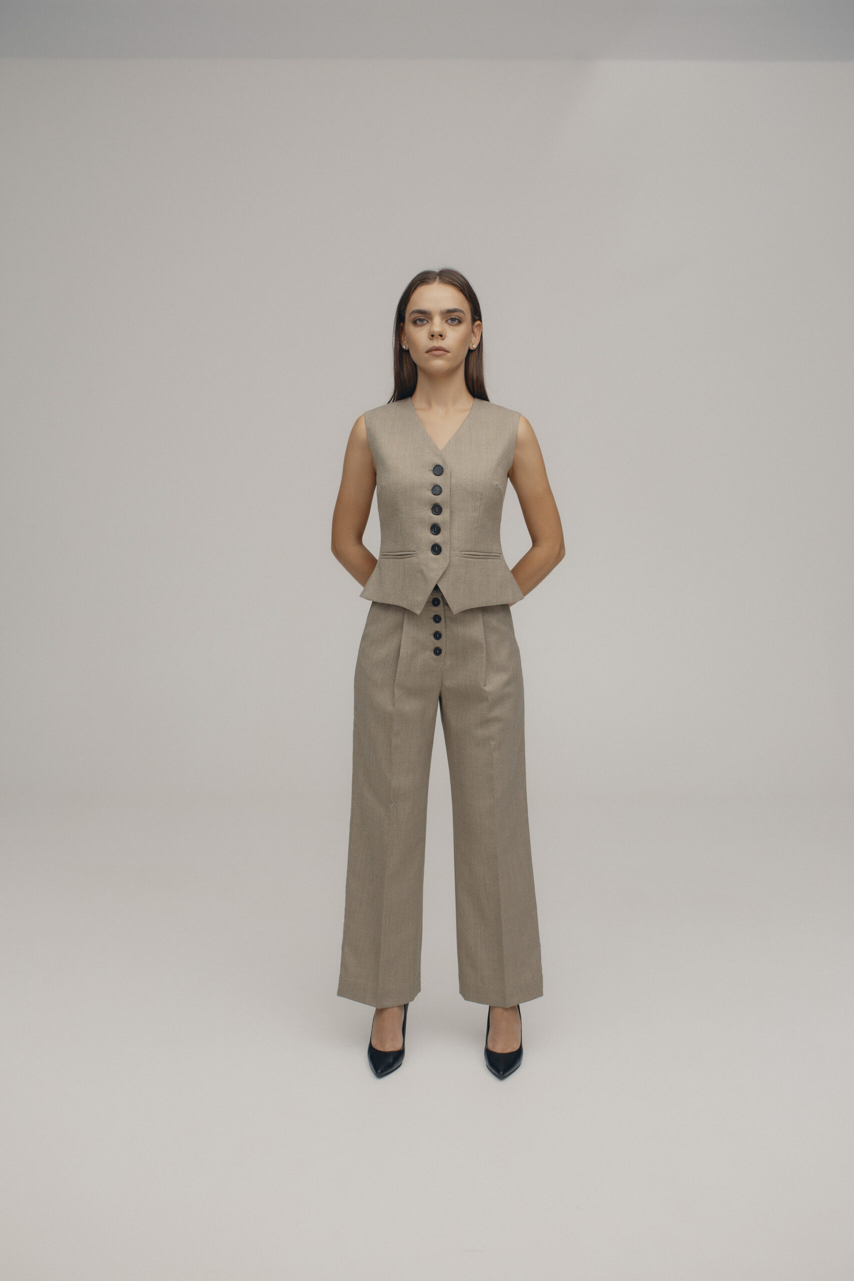Pair these versatile trousers with your favorite shirts or tops for a chic look that transitions effortlessly from day to night. Whether you’re heading to the office or enjoying a weekend brunch, our Button Beige Trousers will keep you looking effortlessly stylish.
