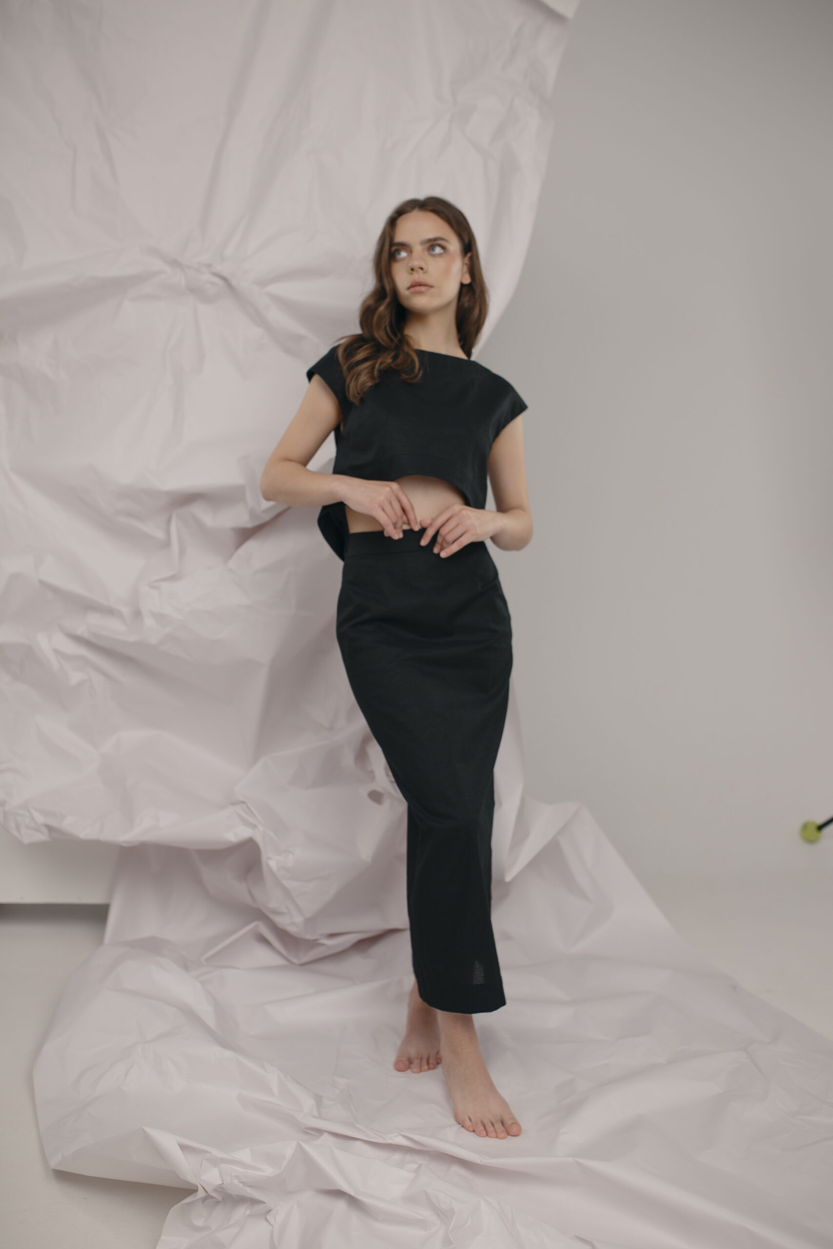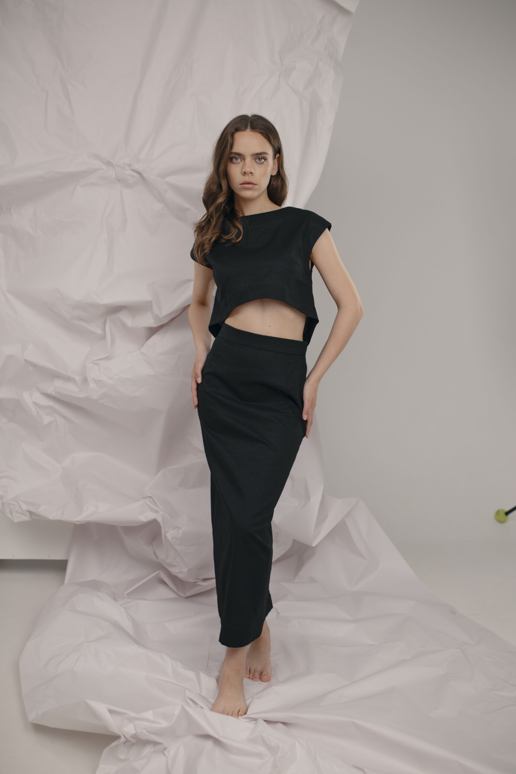 The cropped length and clean lines make it a versatile piece, perfect for pairing with high-waisted skirts or trousers. Ideal for warm days, this top is both stylish and effortlessly cool.