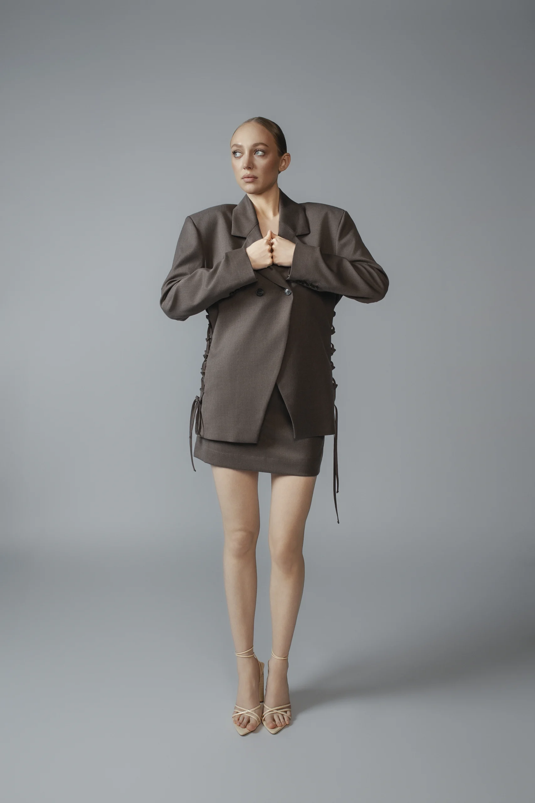 The structured shoulders and double-breasted front create a powerful silhouette, while the fluid fabric brings balance and femininity. A versatile piece that adds polish to any look, whether styled with coordinating pieces or dressed down with denim.