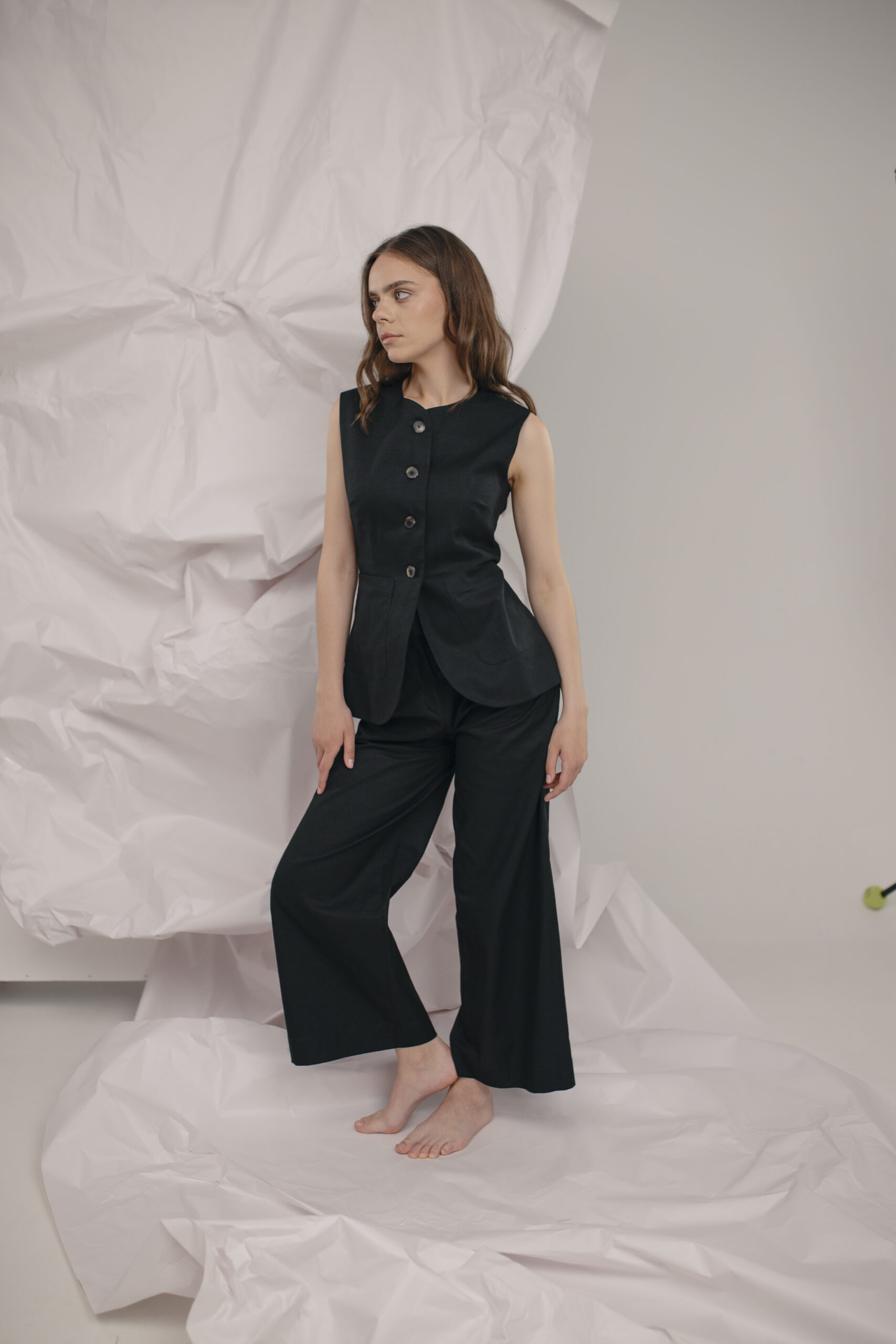 - Features: Tailored vest with button-up front and rounded hemline; high-waisted, wide-leg trousers